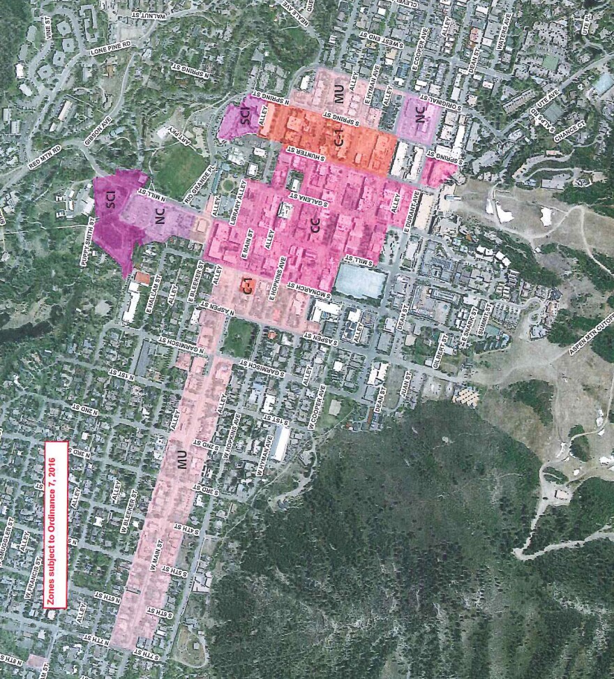 The moratorium applies to property zoned as commercial core, neighborhood commercial, Industrial and mixed use. A map shows most of downtown and main street Aspen under the freeze, but a blank space appears between Galena and Hunter streets where a 50,000 square foot rebuild of city hall is proposed.