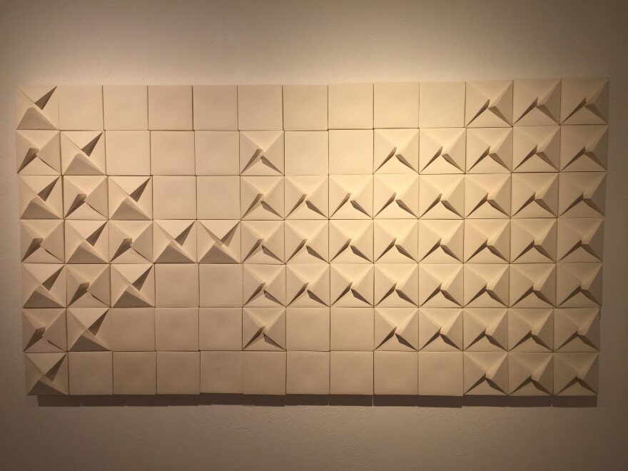 Some paintings are realistic, and some are abstract. The works of Amanda Ramsay are the latter. They are small porcelain squares laid out so they form a rectangle. On some of the squares are triangles that seem to point in a certain direction. That is Ramsay’s piece called “The Path”.