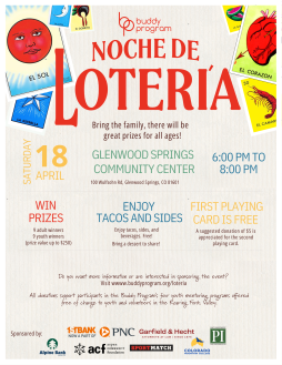 Mark your calendars for April 18th and bring your friends and family along for the Buddy Program’s Noche de Loteria in Glenwood Springs.