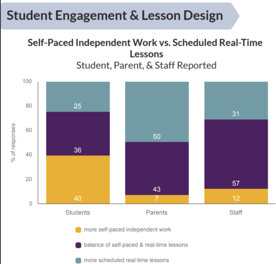 The Roaring Fork School District focused on self-paced independent work when they transitioned to distance learning in the spring due to the COVID-19 pandemic. 40% of students want more asynchronous work, 50% of parents want students to work more directly with their teachers and 57% of staff want to see a balance of both self-paced work and real-time lessons.